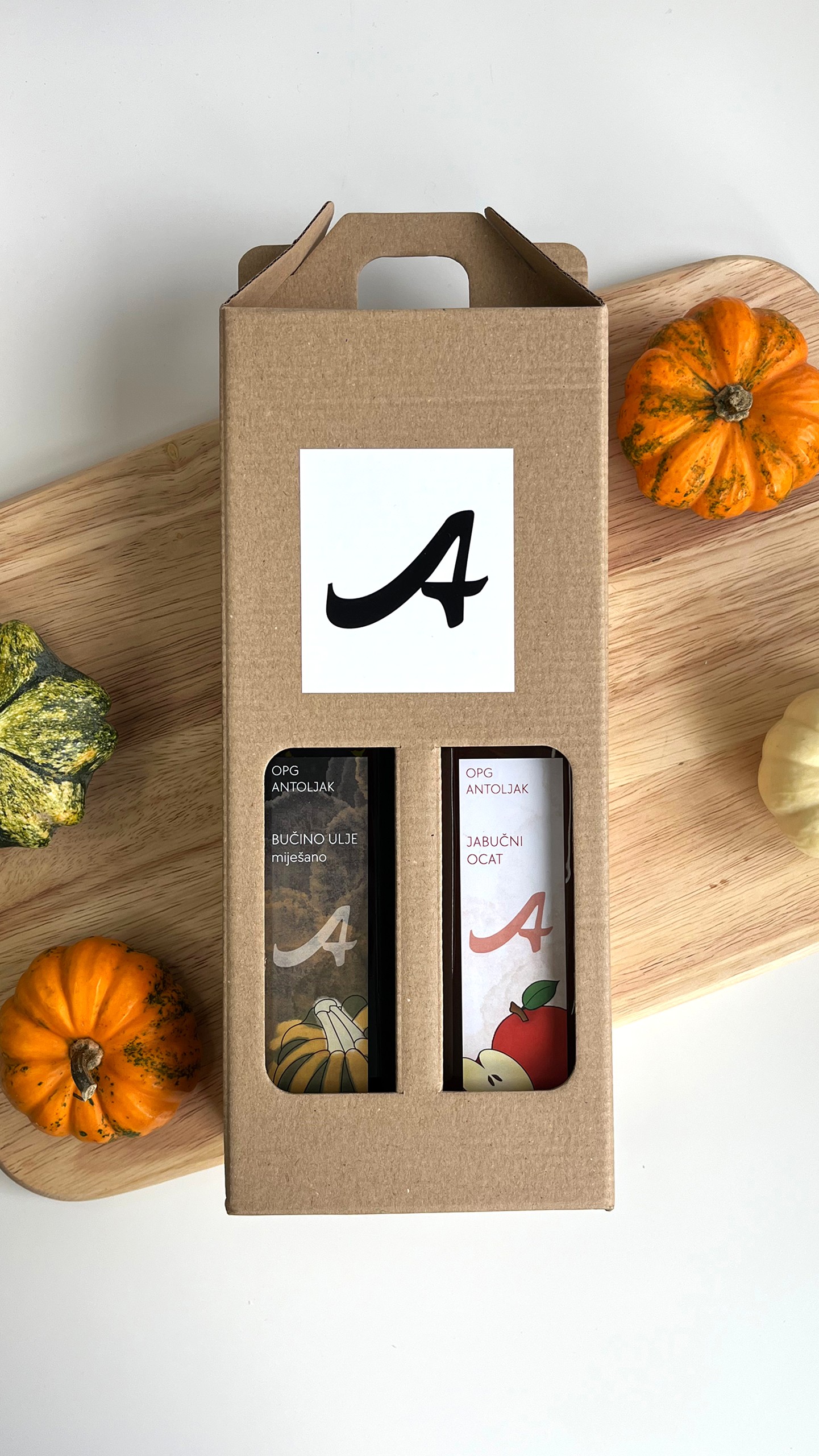 Poklon paket sadrži 0,5 l bučinog ulja i 0,5 l jabučnog octa, pakirano u elegantnu poklon kutiju.