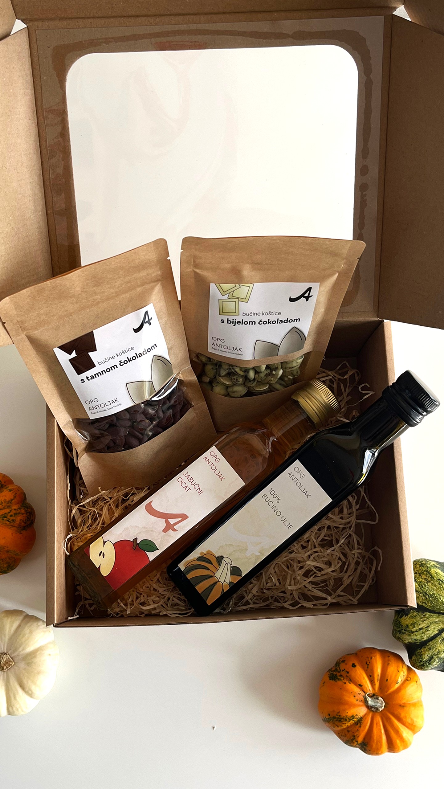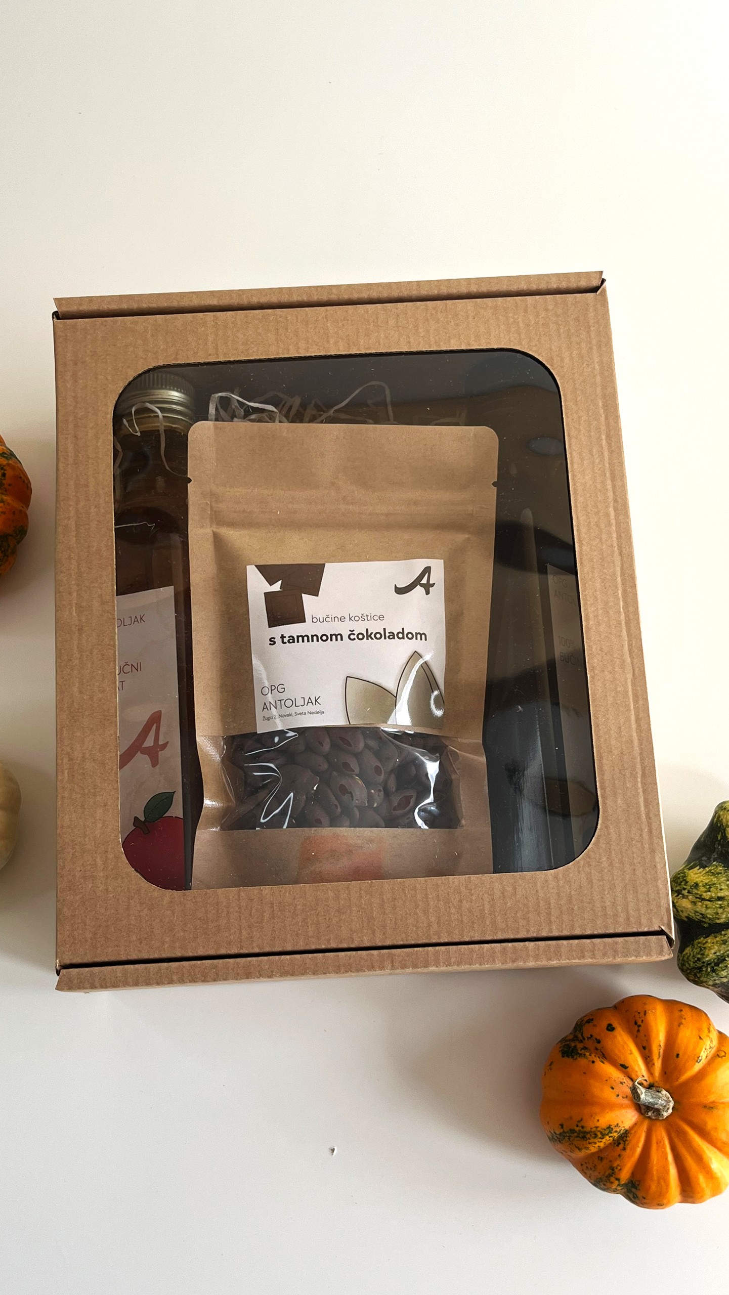 Poklon paket sadrži 1 bočicu 0,25 l 100% bučinog ulja, 1 bočicu 0,25 l jabučnog octa i 2 paketa bučinih koštica u čokoladi, pakirano u elegantnu poklon kutiju. Moguće je birati okuse koštica.